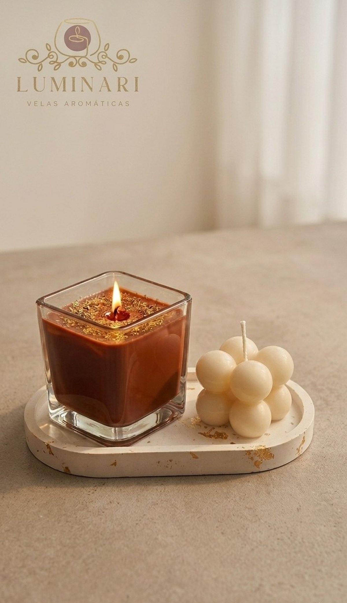 Vela Escultórica de Molde: Una pieza de diseño con forma de cubo que simula una caja de recuerdos.